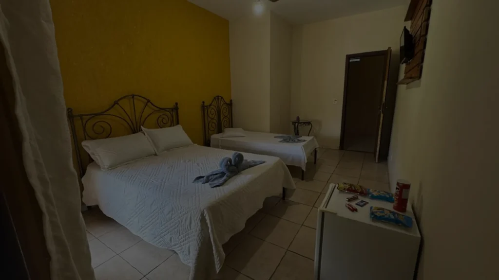Quarto Triplo Standard (Quarto 12) Simplicidade e aconchego em um ambiente funcional. Com cama de casal e cama de solteiro, este quarto é ideal para famílias pequenas ou grupos de amigos. A varanda com rede oferece um convite ao descanso em meio ao verde.